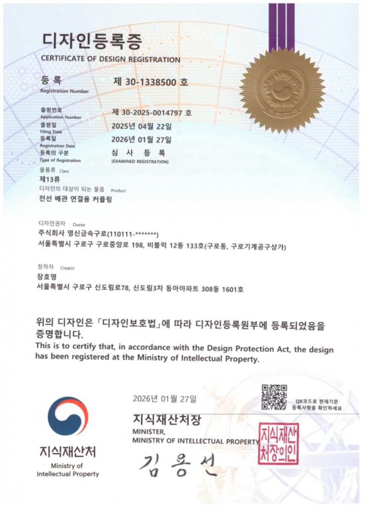 나사없는 전선관 원터치 부속품 EOC 디자인등록증
