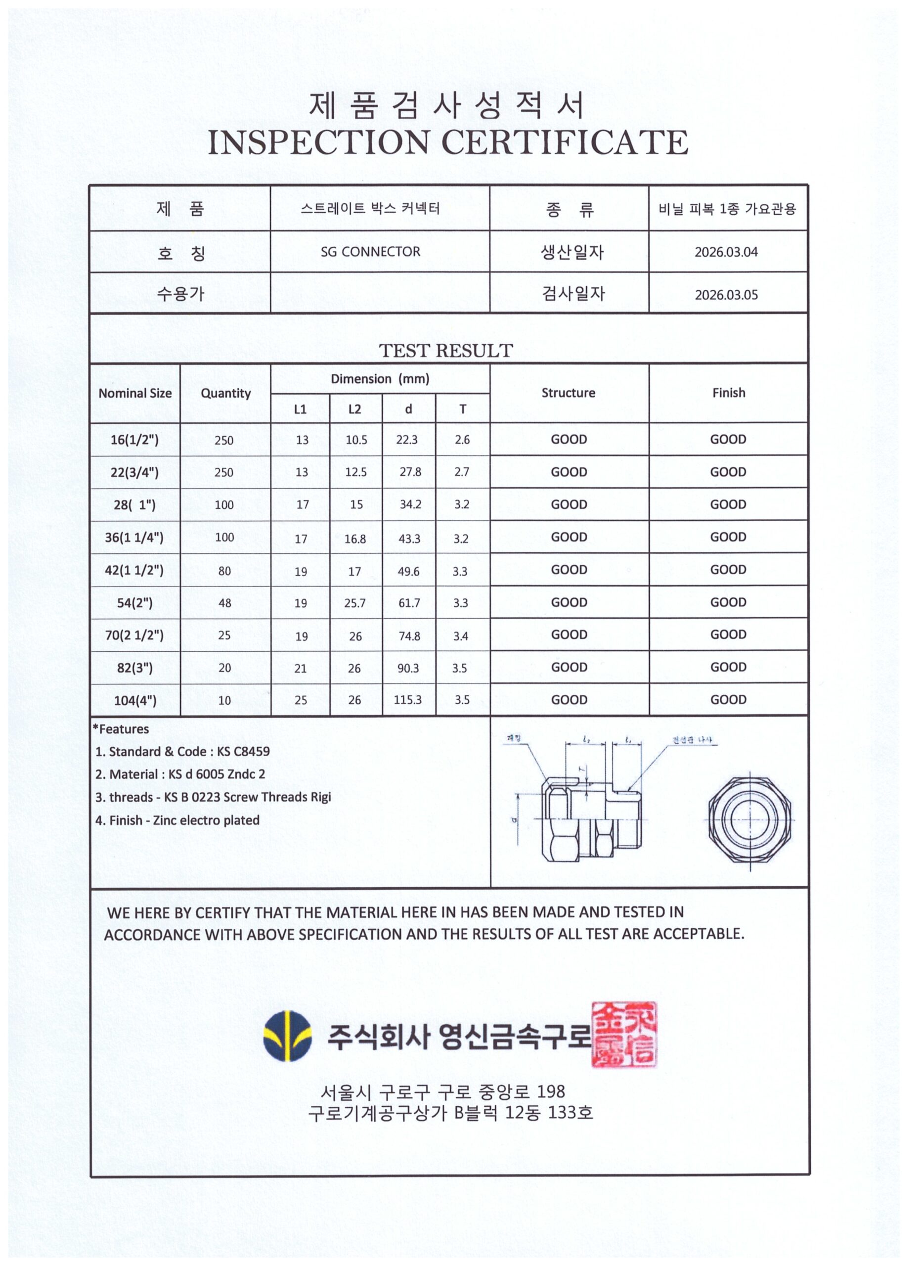 나사없는 전선관용 커넥터(A형) 시험성적서